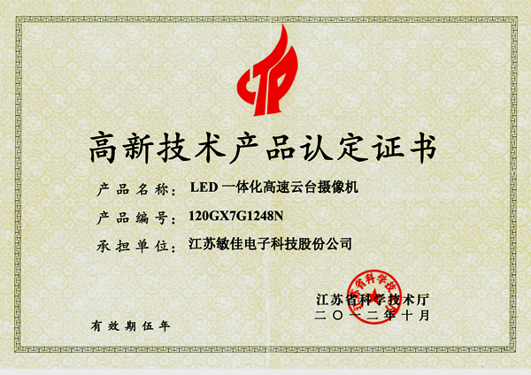 2012年10月,我公司LED一體化高速云臺(tái)攝像機(jī)獲得由江蘇省科學(xué)技術(shù)廳頒發(fā)的“高新技術(shù)產(chǎn)品認(rèn)定證書(shū)“,編號(hào)為:120GX7G1248N。這標(biāo)志著敏佳高速云臺(tái)攝像機(jī)在技術(shù)創(chuàng)新上邁上了一個(gè)新的臺(tái)階,同時(shí)也是對(duì)敏佳高速云臺(tái)創(chuàng)新技術(shù)實(shí)力的充分肯定。 這也是我公司堅(jiān)持自主創(chuàng)新,積極推進(jìn)技術(shù)現(xiàn)代化,取得的優(yōu)秀成果。一直堅(jiān)定不移的走自主創(chuàng)新之路,在研發(fā)上投入了大量的人力物力,積極開(kāi)發(fā)具自主知識(shí)產(chǎn)權(quán)的核心技術(shù)與產(chǎn)品。